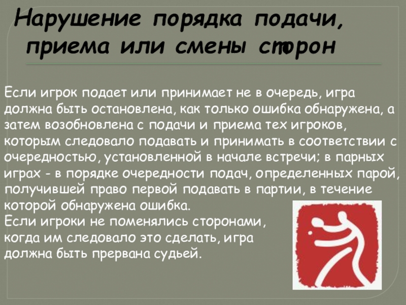 не в очередь, игра должна быть остановлена, как только ошибка обнаружена, а затем возобновлена с подачи и приема тех игроков, которым следовало подавать и принимать в соответствии с очередностью, установленной в начале встречи; в парных играх - в порядке очередности подач, определенных парой, получившей право первой подавать в партии, в течение которой обнаружена ошибка.