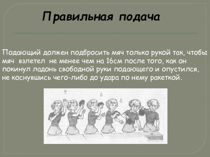 Подающий должен подбросить мяч только рукой так, чтобы мяч взлетел