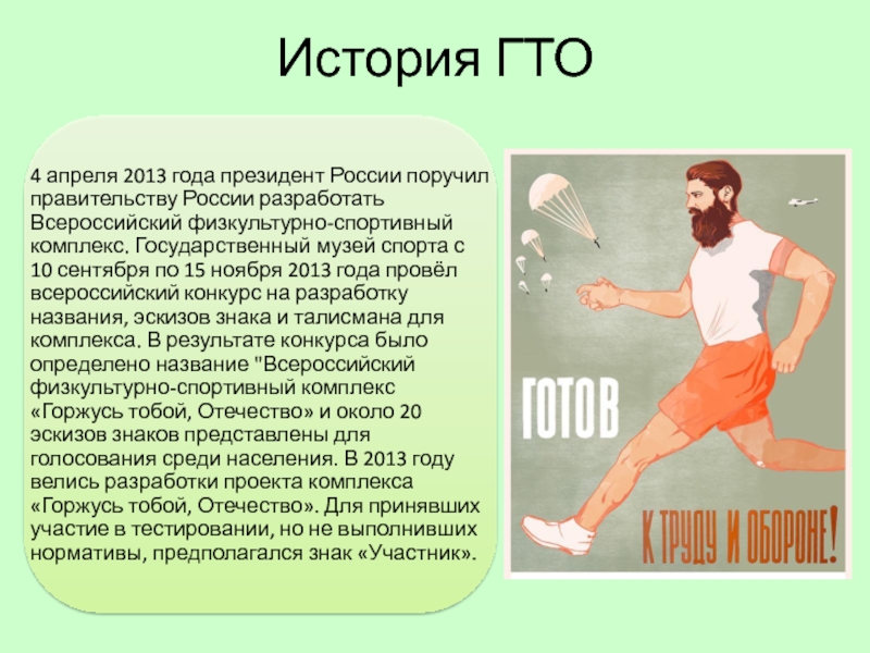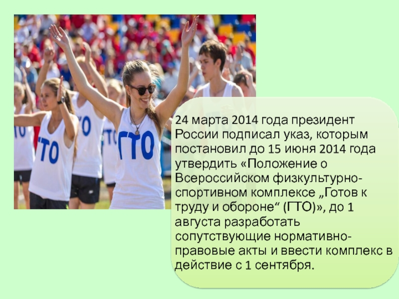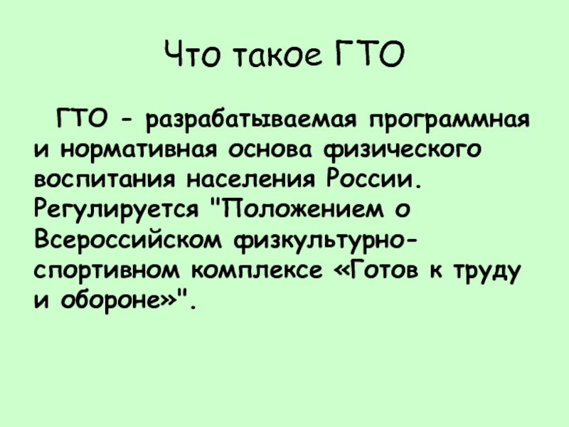 Что такое ГТО  ГТО - разрабатываемая программная и нормативная основа физического воспитания населения России. Регулируется