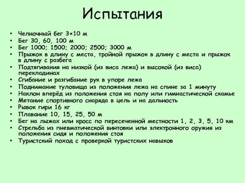 ИспытанияЧелночный бег 3×10 мБег 30, 60, 100 мБег 1000; 1500; 2000; 2500; 3000 мПрыжок в длину с