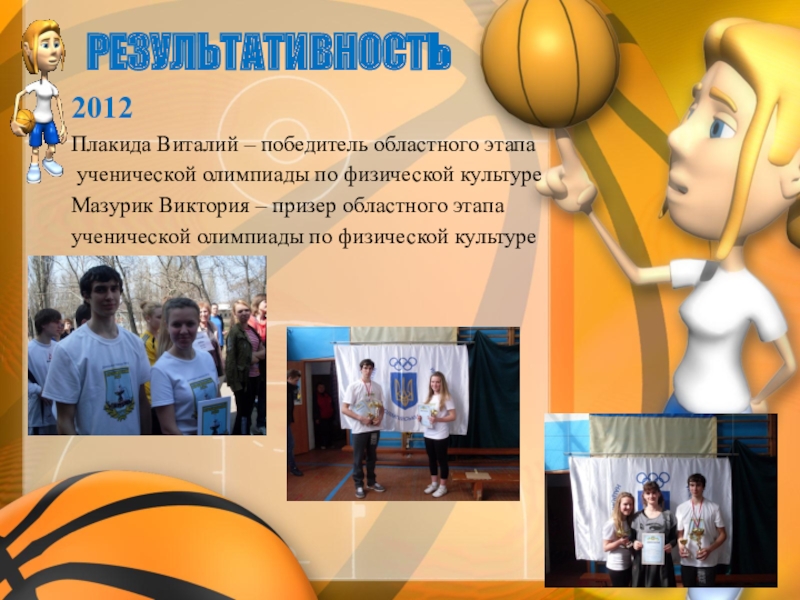 результативность2012 Плакида Виталий – победитель областного этапа ученической олимпиады по физической культуреМазурик Виктория – призер областного