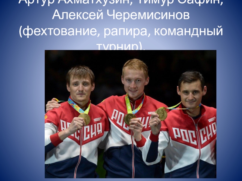 Слайд 35Артур Ахматхузин, Тимур Сафин, Алексей Черемисинов (фехтование, рапира, командный турнир).