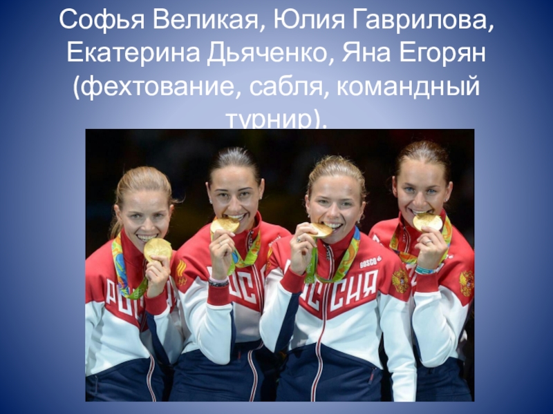 Слайд 36Софья Великая, Юлия Гаврилова, Екатерина Дьяченко, Яна Егорян (фехтование, сабля, командный