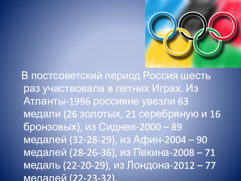 Играх. Из Атланты-1996 россияне увезли 63 медали (26 золотых, 21 серебряную и 16 бронзовых), из Сиднея-2000 – 89 медалей (32-28-29), из Афин-2004 – 90 медалей (28-26-36), из Пекина-2008 – 71 медаль (22-20-29), из Лондона-2012 – 77 медалей (22-23-32).