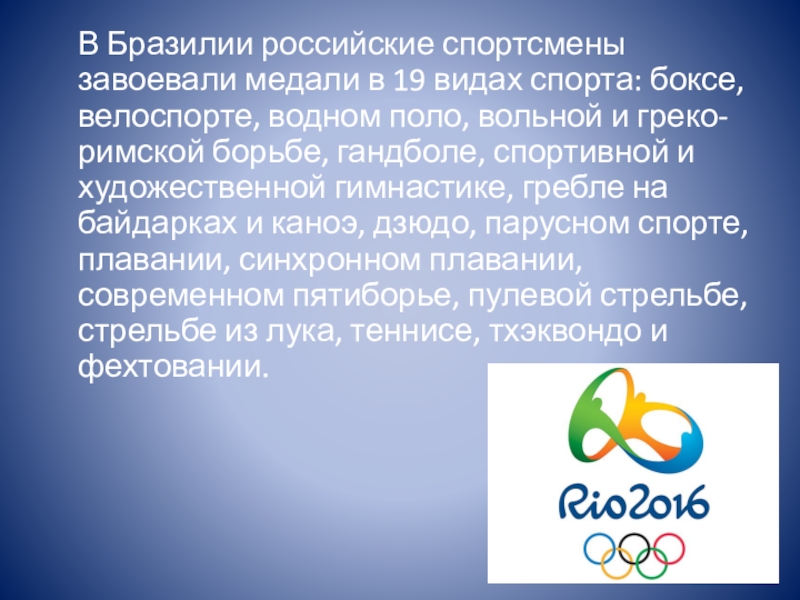 Слайд 28 В Бразилии российские спортсмены завоевали медали в 19 видах