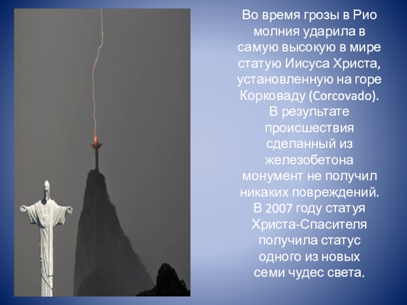 Слайд 16Во время грозы в Рио молния ударила в самую высокую в