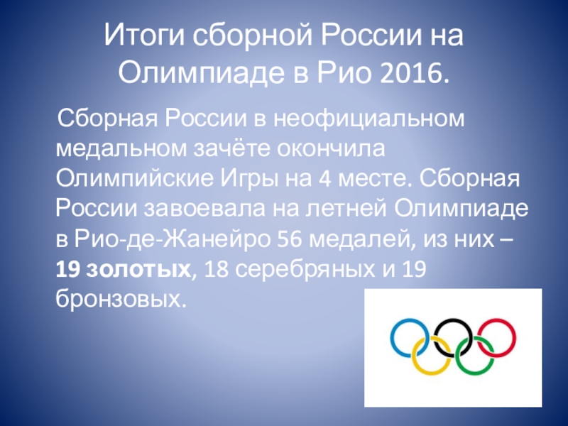 в неофициальном медальном зачёте окончила Олимпийские Игры на 4 месте. Сборная России завоевала на летней Олимпиаде в Рио-де-Жанейро 56 медалей, из них – 19 золотых, 18 серебряных и 19 бронзовых.