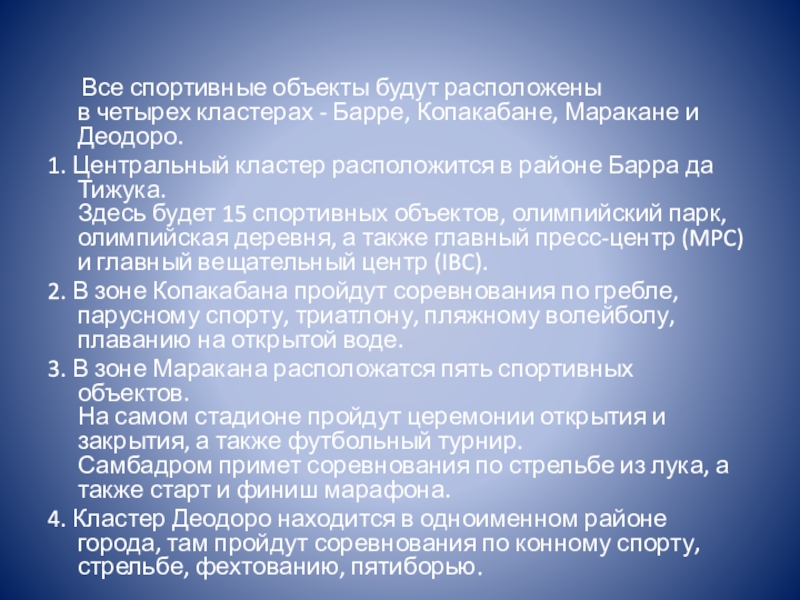 Здесь будет 15 спортивных объектов, олимпийский парк, олимпийская деревня, а также главный пресс-центр (MPC) и главный вещательный центр (IBC).