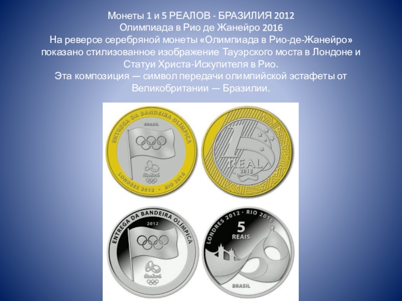 Слайд 7Монеты 1 и 5 РЕАЛОВ - БРАЗИЛИЯ 2012