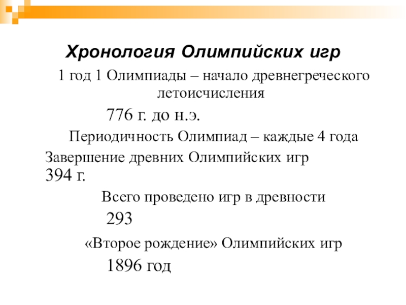 Хронология Олимпийских игр	1 год 1 Олимпиады – начало древнегреческого летоисчисления				776 г. до н.э.	Периодичность Олимпиад – каждые 4