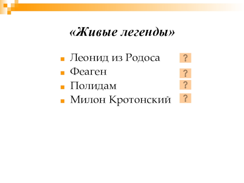 «Живые легенды»Леонид из РодосаФеагенПолидам Милон Кротонский