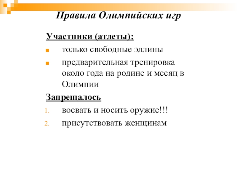 Правила Олимпийских игр  Участники (атлеты):только свободные эллиныпредварительная тренировка около года на родине и месяц в ОлимпииЗапрещалосьвоевать