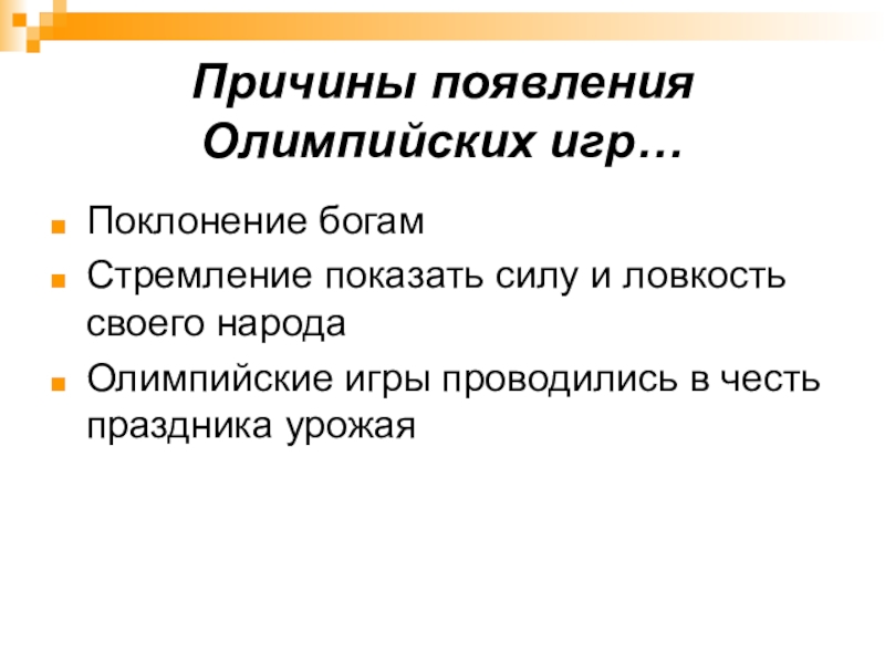 Причины появления Олимпийских игр… Поклонение богамСтремление показать силу и ловкость своего народаОлимпийские игры проводились в честь праздника