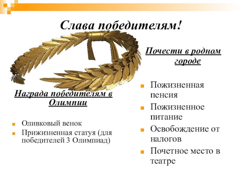 Слава победителям!Награда победителям в Олимпии Оливковый венокПрижизненная статуя (для победителей 3 Олимпиад) Почести в родном городеПожизненная пенсияПожизненное