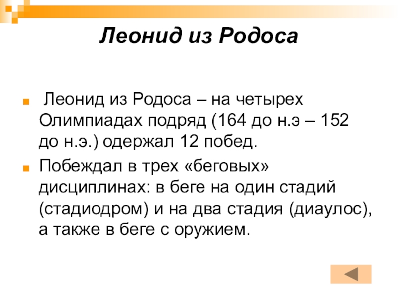 Леонид из Родоса  Леонид из Родоса – на четырех Олимпиадах подряд (164 до н.э – 152