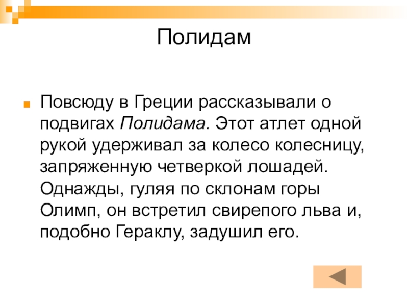 Полидам Повсюду в Греции рассказывали о подвигах Полидама. Этот атлет одной рукой удерживал за колесо колесницу, запряженную