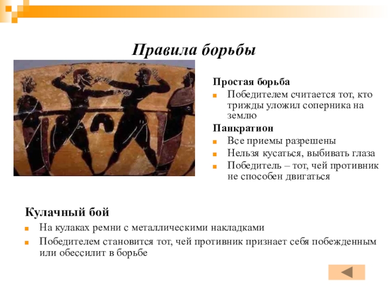 Правила борьбыПростая борьбаПобедителем считается тот, кто трижды уложил соперника на землюПанкратионВсе приемы разрешеныНельзя кусаться, выбивать глазаПобедитель –