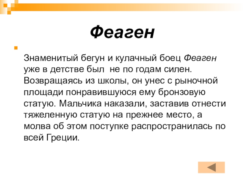 Феаген  Знаменитый бегун и кулачный боец Феаген уже в детстве был не по годам силен. Возвращаясь