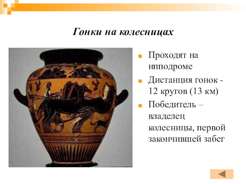 Гонки на колесницахПроходят на ипподромеДистанция гонок - 12 кругов (13 км)Победитель – владелец колесницы, первой закончившей забег