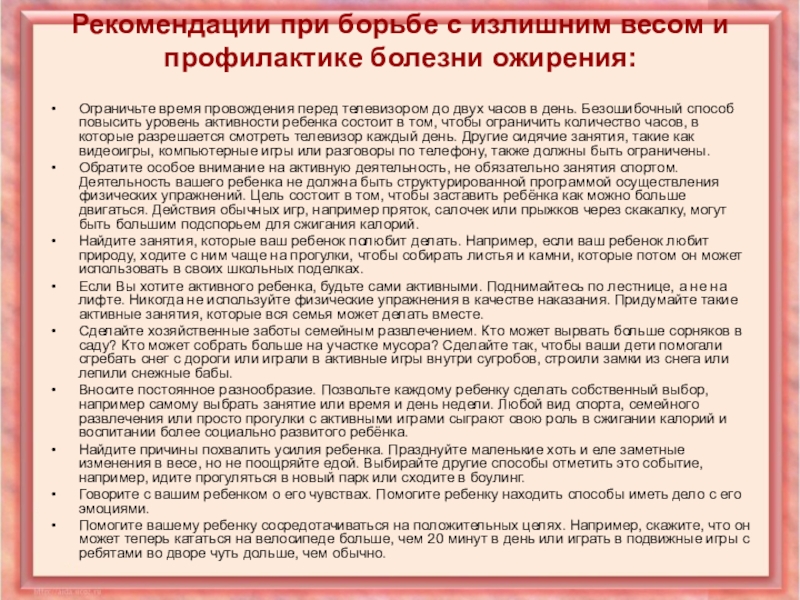 Слайд 23Рекомендации при борьбе с излишним весом и профилактике болезни ожирения: