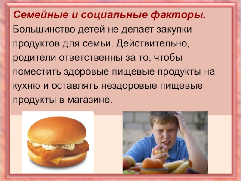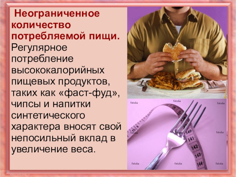 Слайд 9 Неограниченное количество потребляемой пищи. Регулярное потребление высококалорийных пищевых продуктов, таких как