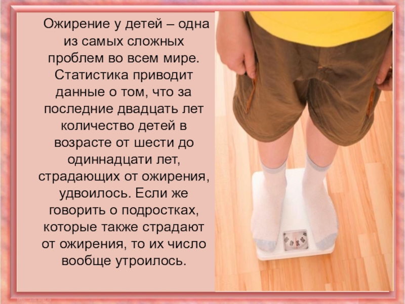мире. Статистика приводит данные о том, что за последние двадцать лет количество детей в возрасте от шести до одиннадцати лет, страдающих от ожирения, удвоилось. Если же говорить о подростках, которые также страдают от ожирения, то их число вообще утроилось.