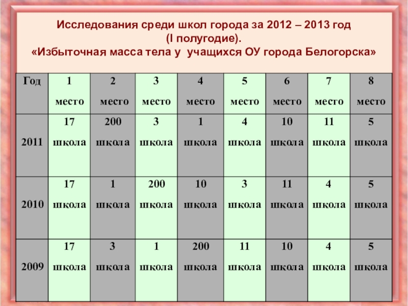 Слайд 21Исследования среди школ города за 2012 – 2013 год