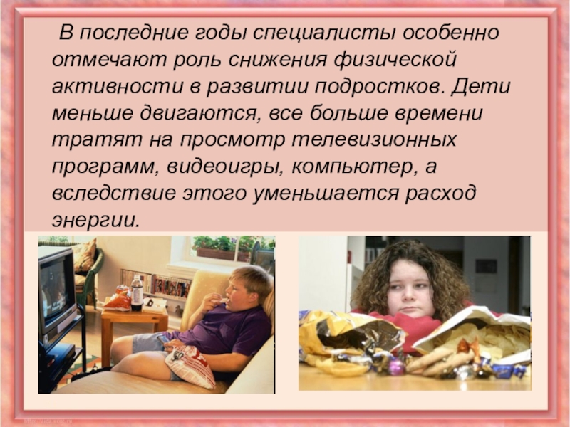 развитии подростков. Дети меньше двигаются, все больше времени тратят на просмотр телевизионных программ, видеоигры, компьютер, а вследствие этого уменьшается расход энергии.