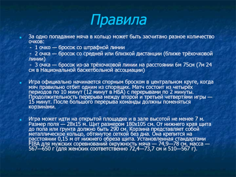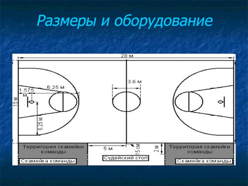 Всего в команде 12 человек, замены не ограничены. За мяч, заброшенный с ближней и средней дистанции, засчитывается 2 очка, с дальней — 3 очка. Штрафной бросок оценивается в 1 очко. Стандартный размер баскетбольной площадки 28 метров в длину и 15 метров в ширину.