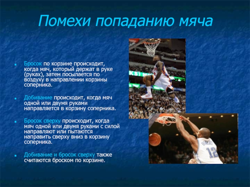 Бросок сверху происходит, когда мяч одной или двумя руками с силой направляют или пытаются направить сверху вниз в корзину соперника.