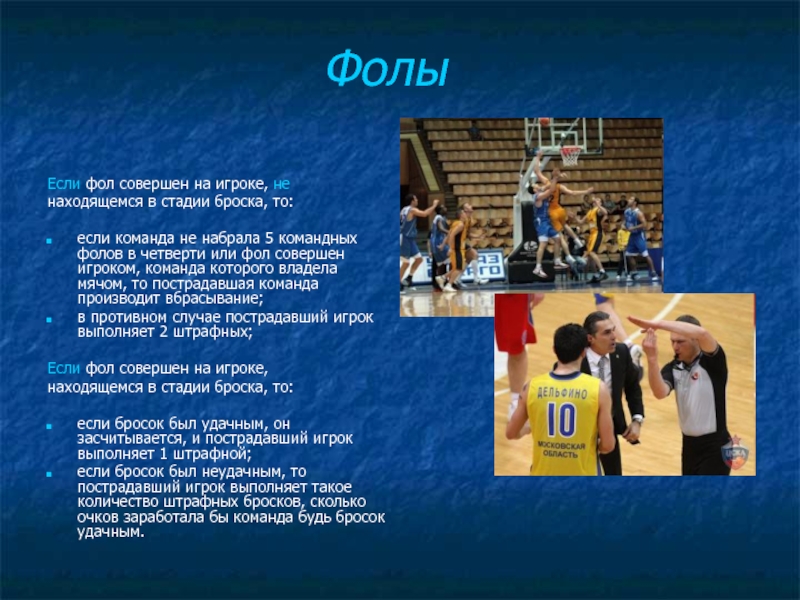 не набрала 5 командных фолов в четверти или фол совершен игроком, команда которого владела мячом, то пострадавшая команда производит вбрасывание;