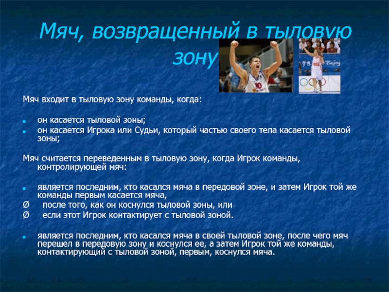 нарушения возвращения мяча в зону защиты (зона) — команда, владеющая мячом в зоне нападения перевела его в зону защиты.