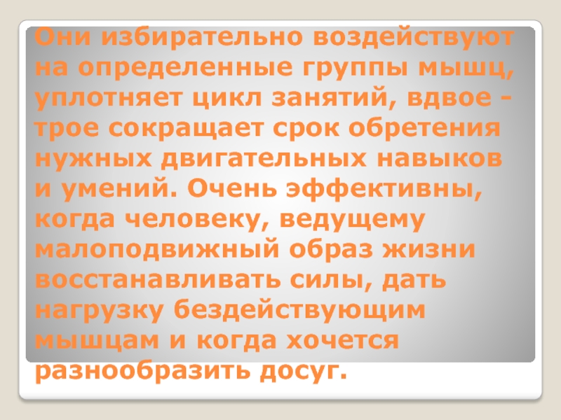 Слайд 8Они избирательно воздействуют на определенные группы мышц, уплотняет цикл занятий, вдвое