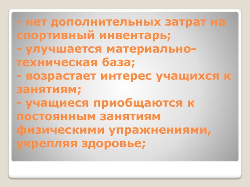 Слайд 39- нет дополнительных затрат на спортивный инвентарь;