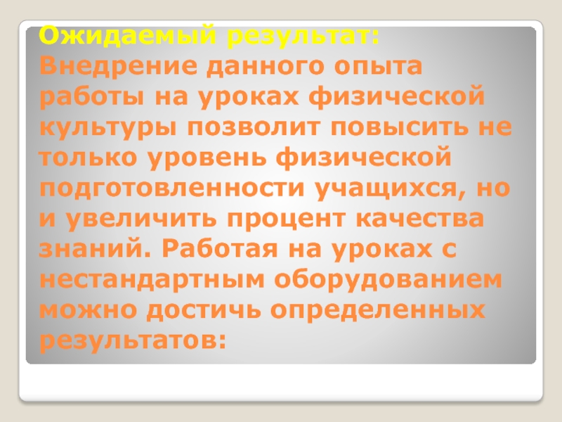 не только уровень физической подготовленности учащихся, но и увеличить процент качества знаний. Работая на уроках с нестандартным оборудованием можно достичь определенных результатов: