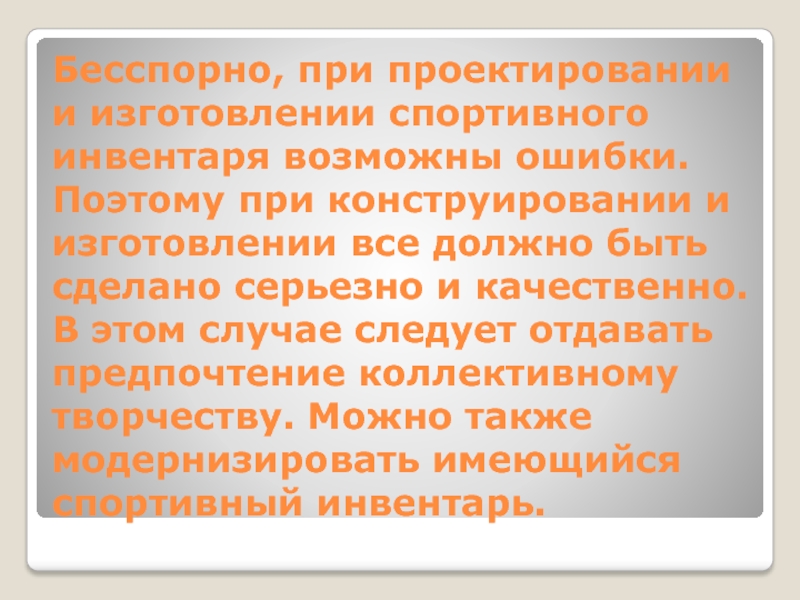 Слайд 9Бесспорно, при проектировании и изготовлении спортивного инвентаря возможны ошибки. Поэтому при