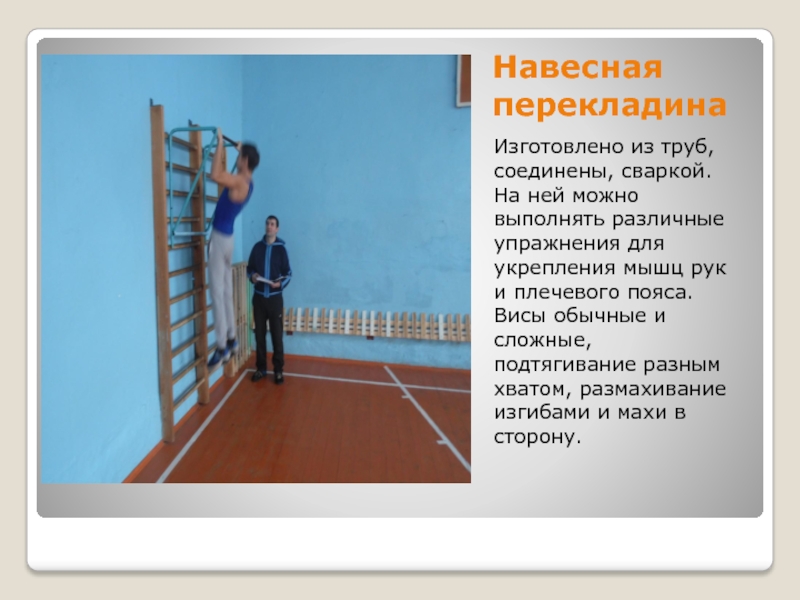 Прикреплен к стене. Применяется для выполнения подтягивания разным хватом, размахивание изгибами
