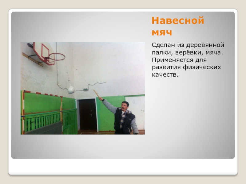 Сделан из деревянной палки, верёвки, мяча. Применяется для развития физических