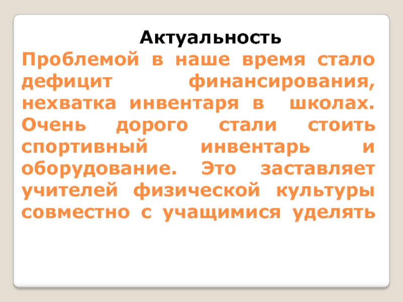 в школах. Очень дорого стали стоить спортивный инвентарь и оборудование. Это заставляет учителей физической культуры совместно с учащимися уделять