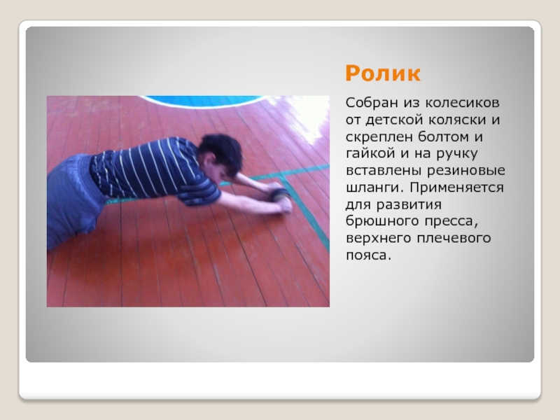 гайкой и на ручку вставлены резиновые шланги. Применяется для развития брюшного пресса, верхнего плечевого пояса.