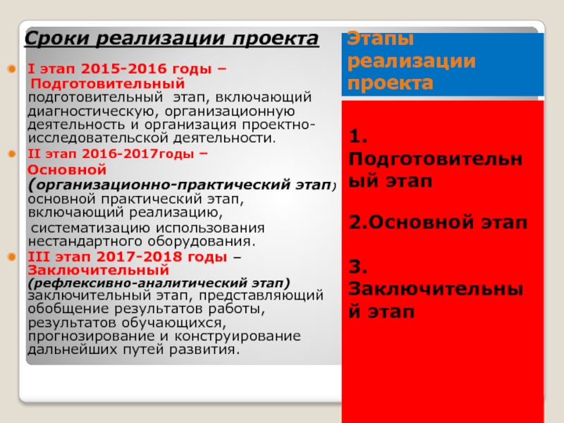 Подготовительный подготовительный этап, включающий диагностическую, организационную деятельность и организация проектно-исследовательской деятельности.