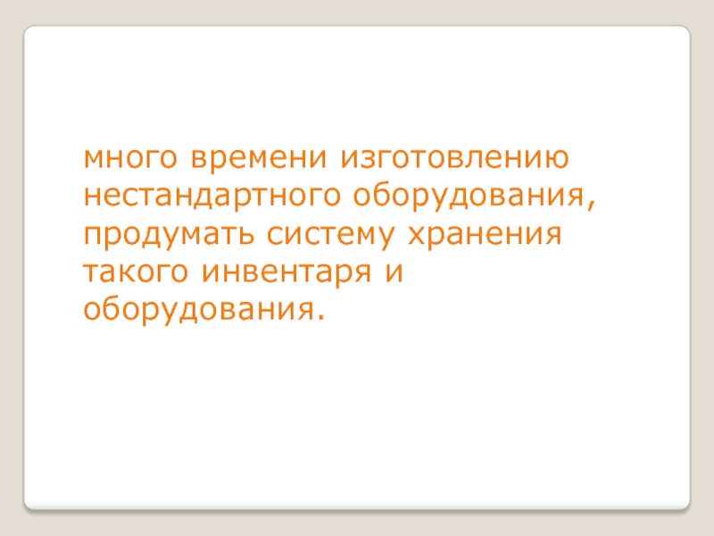 Слайд 3много времени изготовлению нестандартного оборудования, продумать систему хранения такого инвентаря и