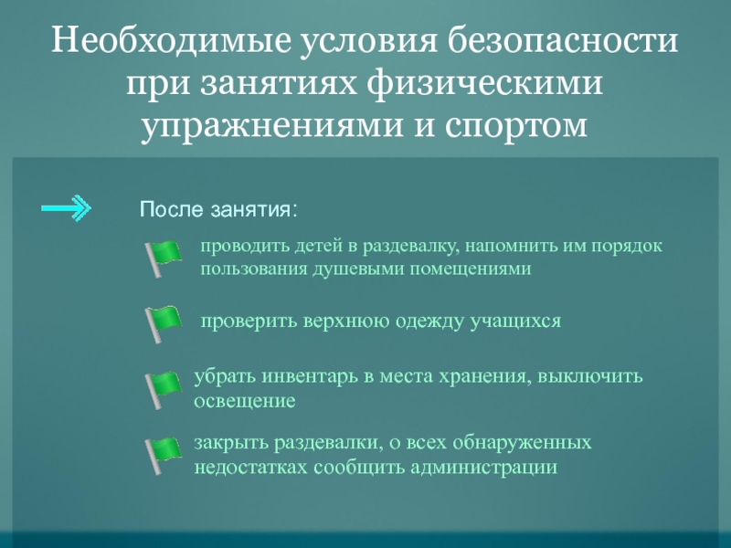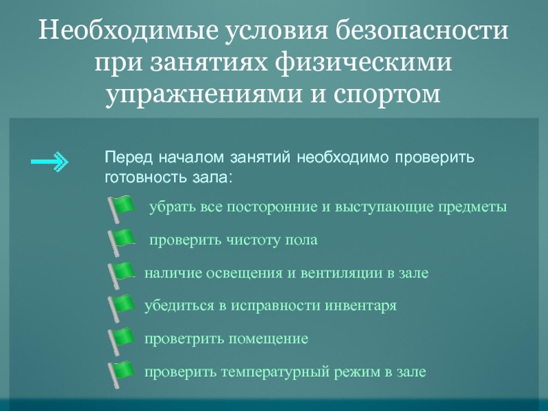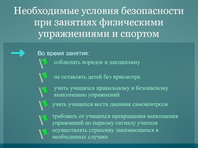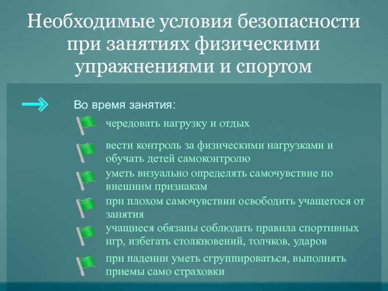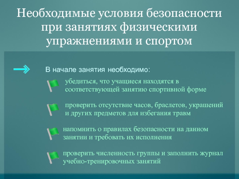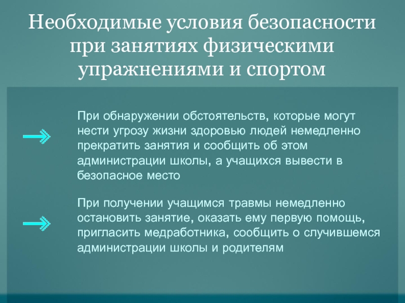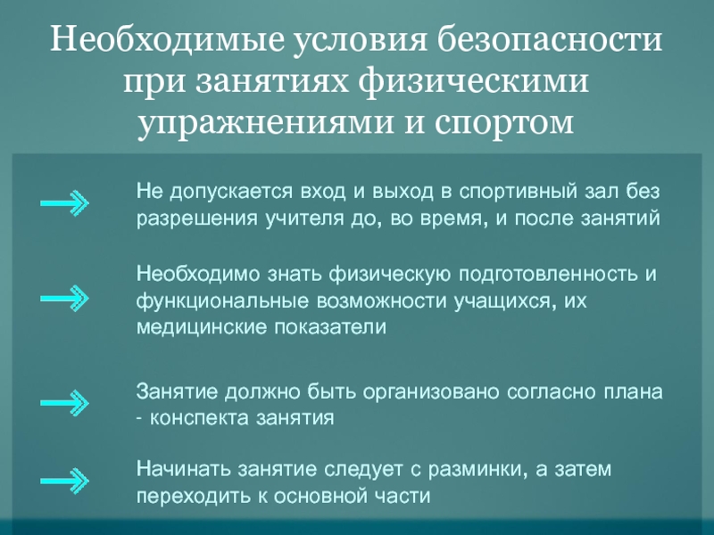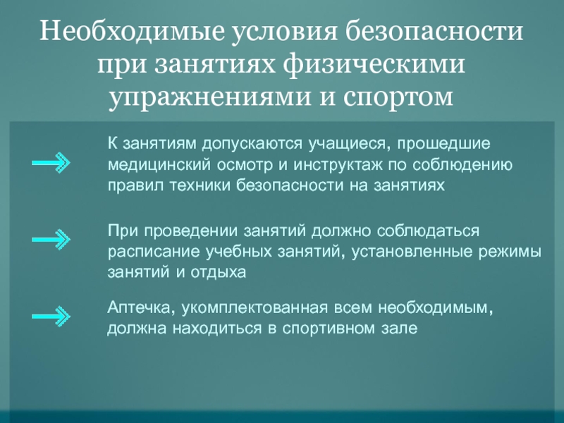 Слайд 13Необходимые условия безопасности при занятиях физическими упражнениями и спортом
