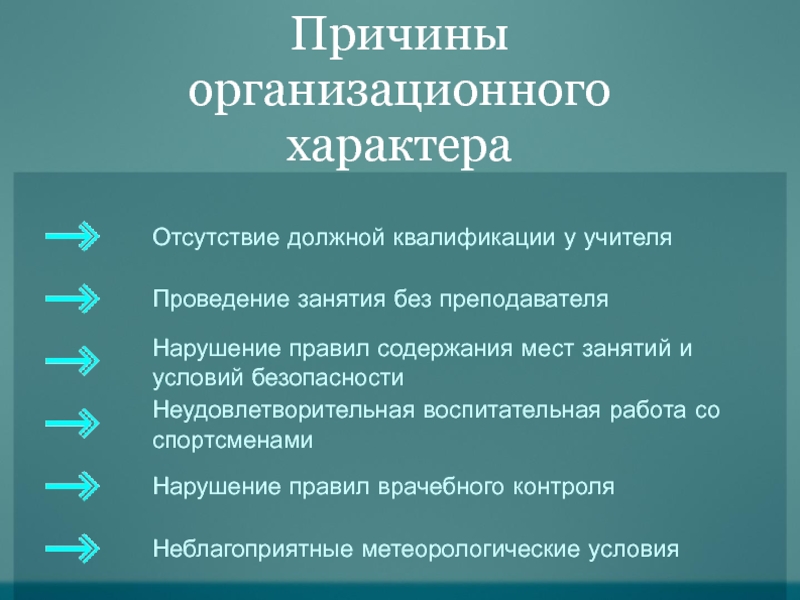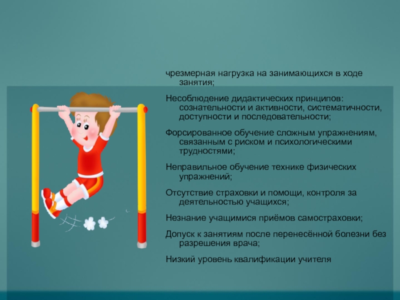 Слайд 7чрезмерная нагрузка на занимающихся в ходе занятия;