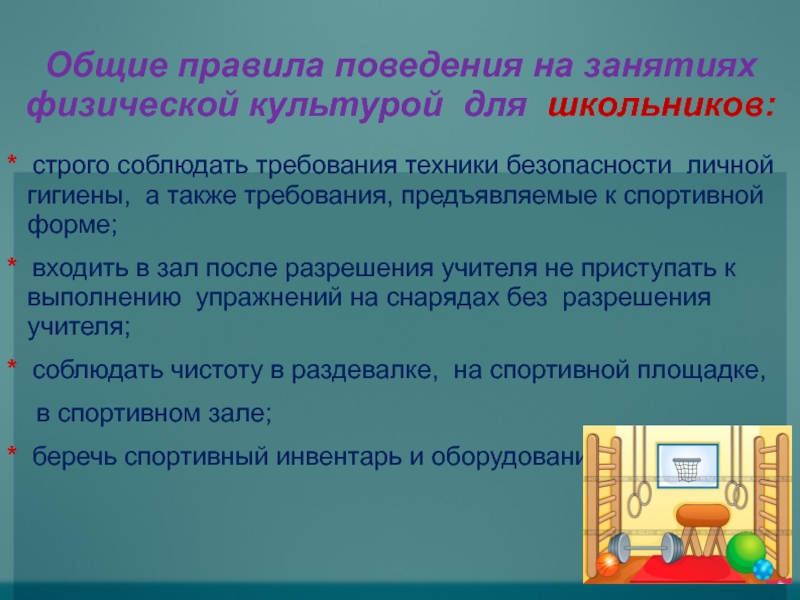 * входить в зал после разрешения учителя не приступать к выполнению упражнений на снарядах без разрешения учителя;