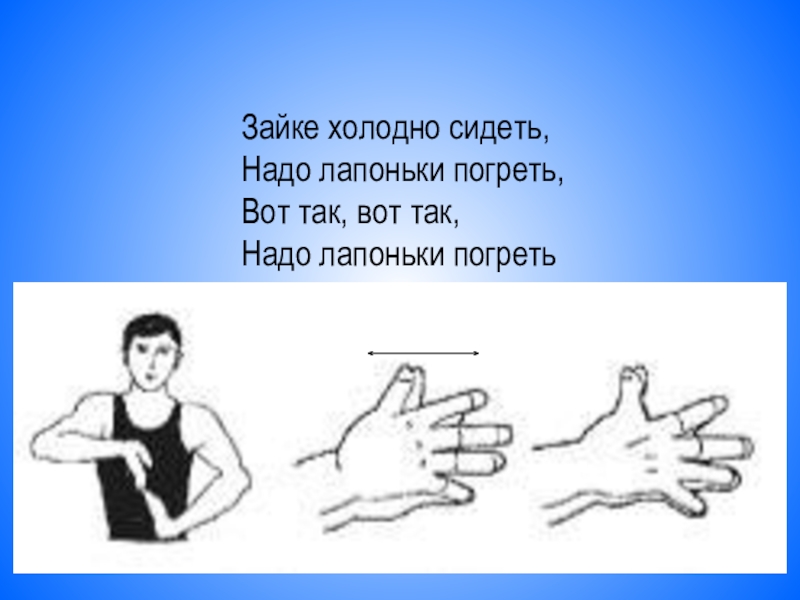Слайд 3Зайке холодно сидеть, Надо лапоньки погреть, Вот так, вот так,