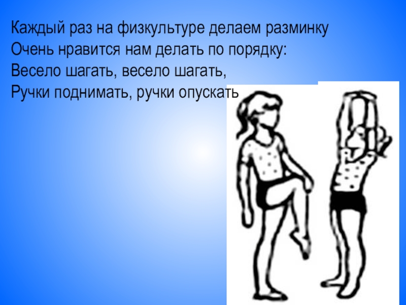 Каждый раз на физкультуре делаем разминку  Очень нравится нам делать по порядку:  Весело шагать, весело