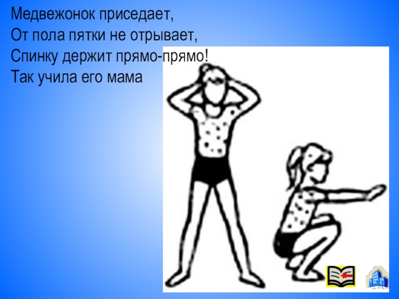 Слайд 9Медвежонок приседает, От пола пятки не отрывает, Спинку держит прямо-прямо! Так