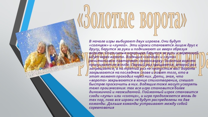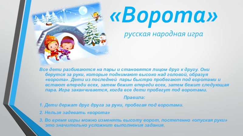 друг к другу. Они берутся за руки, которые поднимают высоко над головой, образуя «ворота». Дети из последней пары быстро пробегают под воротами и встают впереди всех, затем бежит впереди всех, затем бежит следующая пара. Игра заканчивается, когда все дети пробегут под воротами.
