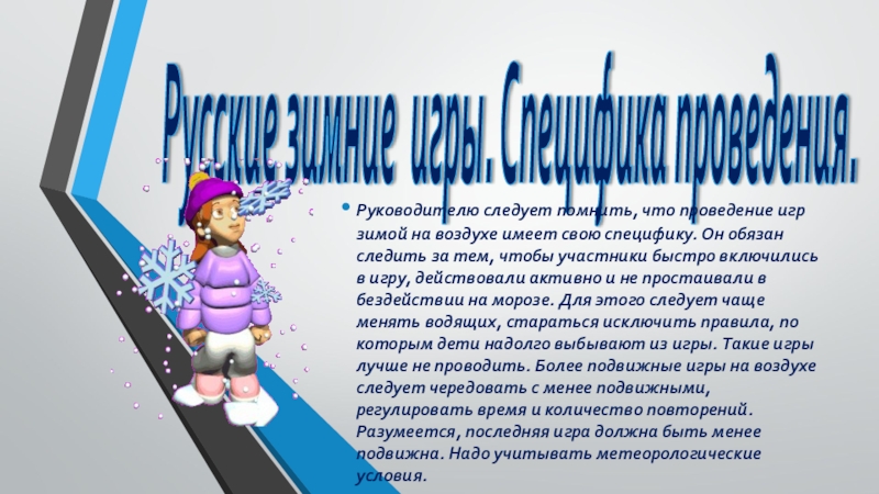 на воздухе имеет свою специфику. Он обязан следить за тем, чтобы участники быстро включились в игру, действовали активно и не простаивали в бездействии на морозе. Для этого следует чаще менять водящих, стараться исключить правила, по которым дети надолго выбывают из игры. Такие игры лучше не проводить. Более подвижные игры на воздухе следует чередовать с менее подвижными, регулировать время и количество повторений. Разумеется, последняя игра должна быть менее подвижна. Надо учитывать метеорологические условия.